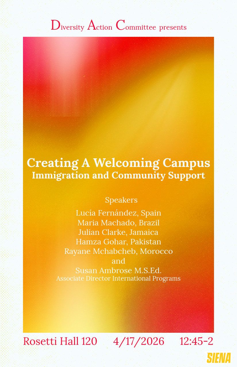 I’m co-chairing the Siena University Diversity Action Committee this semester with Taewoo Kang. Our second event of 2026 is “Creating a Welcoming Campus: Immigration and Community Support.” Hope to see the Siena community there! Follow DAC on Instagram!